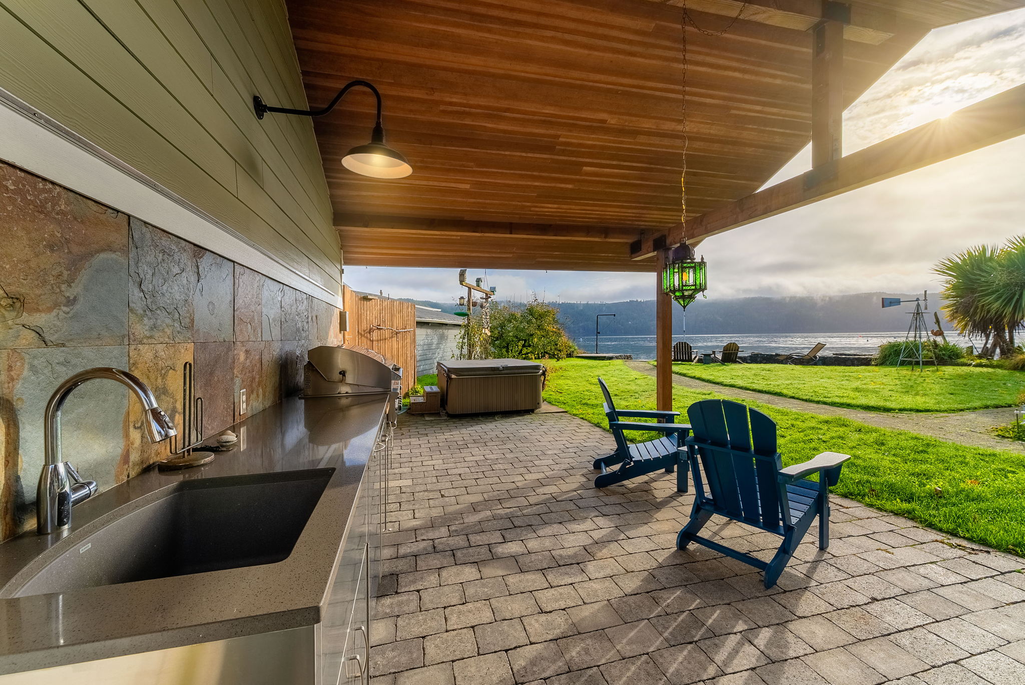Rain or shine, enjoy the backyard with outdoor kitchen (BBQ, refrigerator, etc.), fire pit, hot tub, and outdoor shower! Private stairs lead to the beach. Please note that beaches here are private, so please stay close to the property. This is the perfect place to watch for marine life, and it is a paradise for bird watchers!
