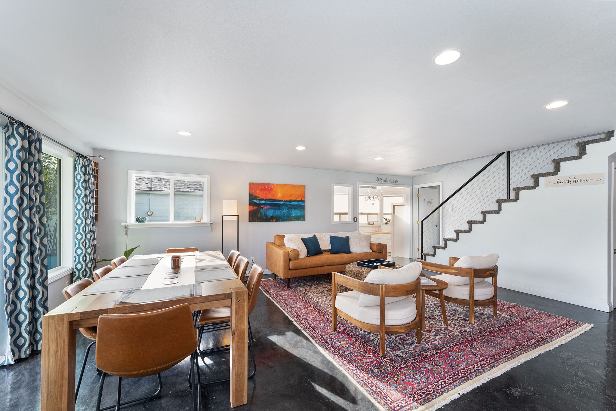 This fully furnished 2 bed/2 bath waterfront house will comfortably sleep up to 6 guests (max 4 adults). The master bedroom suite on the upper floor features a king size bed, stunning water views from the balcony, and spa-like bathroom. There is also an office with a sleeper sofa. Note that there is a hallway, but no door separating the master bedroom from the office, or the upstairs level from the main floor. On the main floor you will find another bedroom with a bunk bed and another bathroom. There is also a separate sun room and laundry room. The dining room provides a comfortable space for your entire party to enjoy meals or play board games, while enjoying views of the beautiful Pacific Northwest. The living room is furnished with comfortable seating, flat screen TV, and gas fireplace. The kitchen includes gas stove, refrigerator/freezer with water filter, ice maker, and soda stream, coffee station (coffee grinder and drip coffee maker; coffee beans, sugar, and creamer are provided), kettle, microwave, and toaster. Of course, there are plenty of pots and pans, utensils, and dishes.